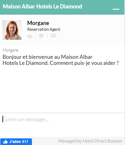 Vous pouvez ajouter la photo et le nom du collaborateur de l'hôtel présent sur le livechat afin d’augmenter le relationnel avec le client grâce à une interaction plus humanisée.